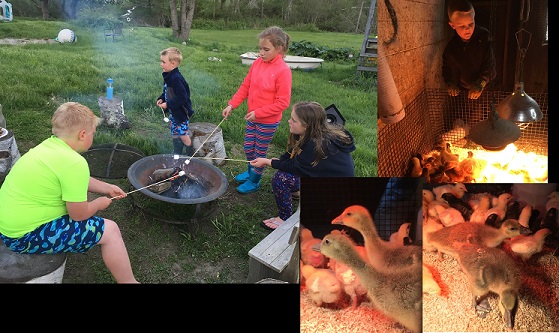 The kids enjoy early spring Smore's and Bennett welcomes his new flock of chicks including two goslings, names Dot Dot and So So!